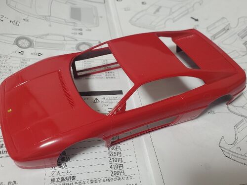 こんにちは! 348は部品の成形が終わったので一気に塗装します。 セミグロスブラックでシャーシ、内装、足回りを塗装 エンジン、ブレーキ周りはシルバーで塗装 いよいよお楽しみのボディ塗装 白と赤を混ぜたピンクで下地塗装を行う。 ピンクにするのはグレー…