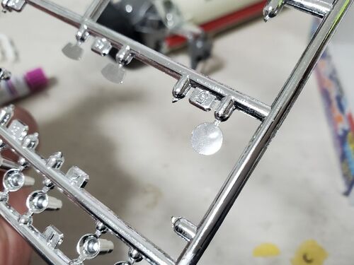 はい、こんにちは! RA273の昨夜の作業です。 組立図⑧リアサスペンションの組立てです。 メッキパーツをナックル部の部品で挟み込みます メッキパーツを避けて合わせ目消し、塗装が必要なので手間がかかります。 トレーリングアーム?を折らないように慎重に…