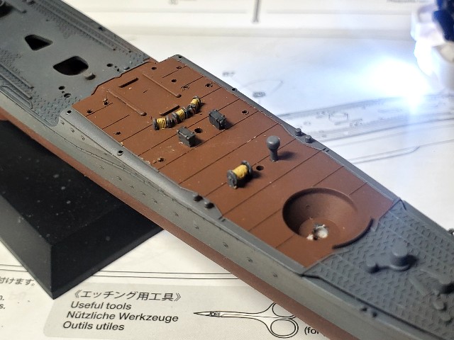 2023-07-26 駆逐艦【雪風】⑧甲板の小物類 こんにちは! 雪風の進捗です。 甲板に付く小さな部品たちを取り付けていきます。 ロープを巻く機械なども面相筆で塗装していきます。 後部甲板には爆雷発射機(四角いやつ)を取付けたりしていきます。 艦橋回りの部品を載せて確認。その他、主砲の台座などを組み込んでタイムアップ サクッと30分あまりの作業でした。 暑い日が続いています。皆様熱中症には気をつけましょう。 つづく。